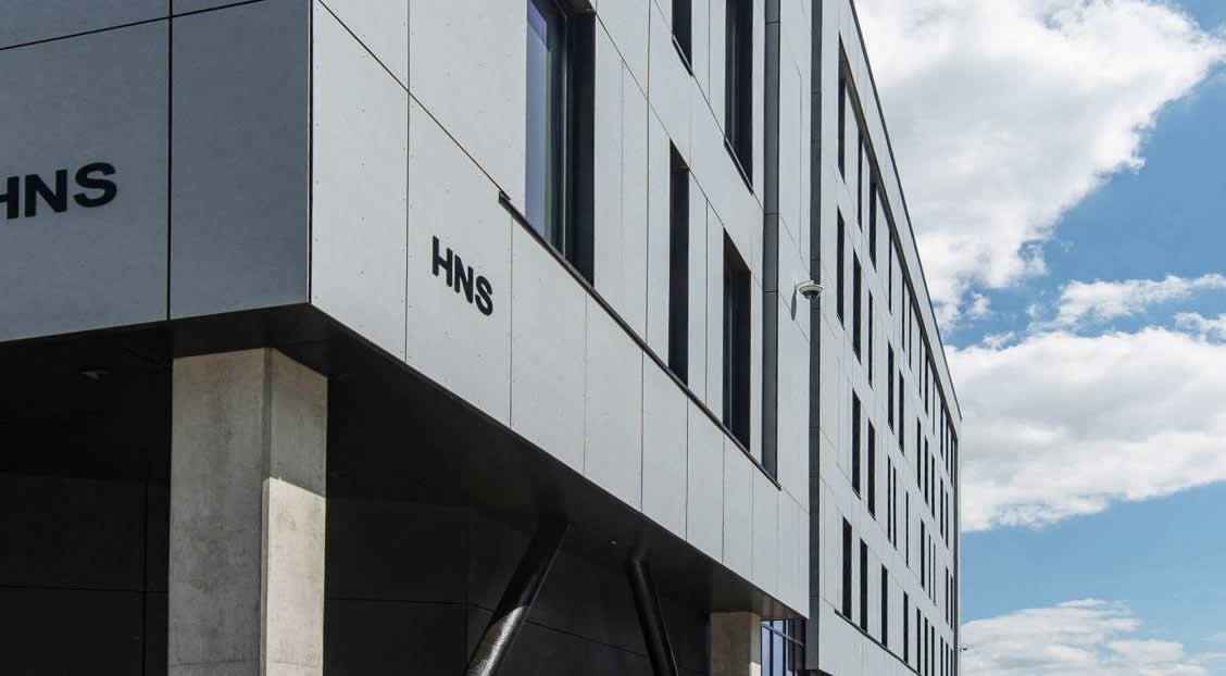Les idées initiales concernant le motif des fenêtres extérieures et l’agencement de façade correspondant ont été traduites dans un bardage modulaire Copanel-Swisspearl garant d’une façade extérieure propre. La façade sombre et légèrement en retrait au niveau de la zone principale permet au lumineux volume de la construction de flotter au-dessus de l’ensemble. Les rainures linéaires renforcent cette impression, conférant aux panneaux de couleur anthracite une sobriété mate.