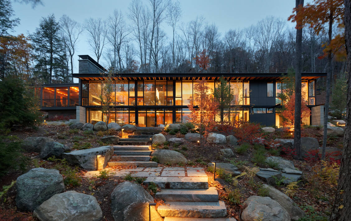 immobiliSituée dans une région reculée de l’Ontario, au Canada, cette maison individuelle est construite sur un terrain qui descend en pente douce vers le lac Haliburton. Le volume long et étroit orienté vers le sud choisi comme plan pour cette maison permet à l’ensemble des pièces principales de bénéficier d’une abondante lumière naturelle, et de perspectives à travers les arbres jusqu’au lac.
