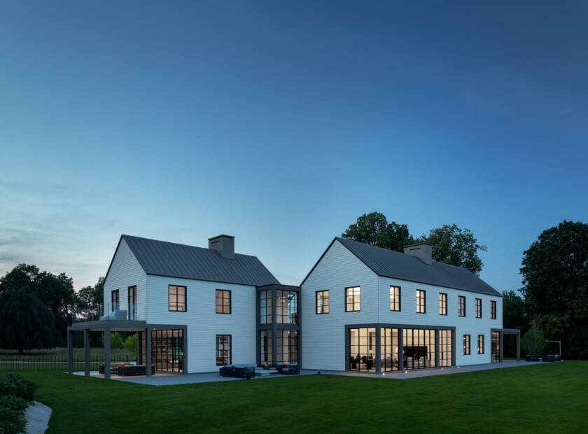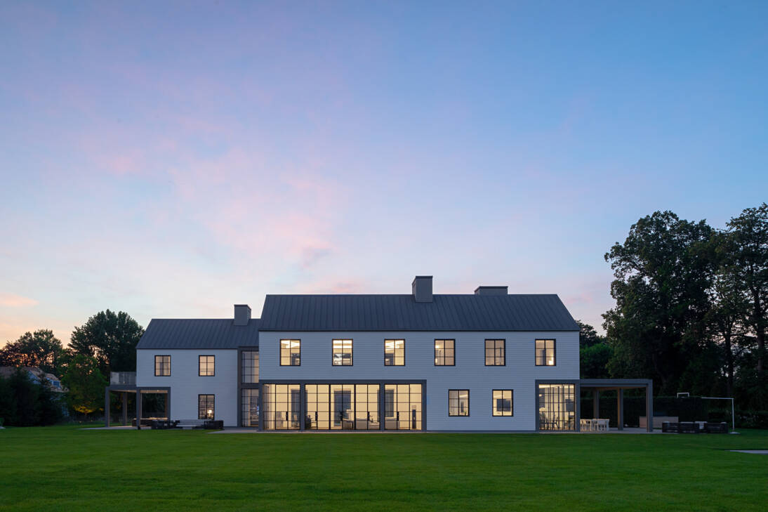 La maison Beachside, située en bord de mer face au Long Island Sound, sépare le Connecticut de Long Island, dans l’État de New York. Elle se trouve en contrebas de la route menant à Red Barn, une dépendance conçue par Ferris et présentée dans le n°27 du magazine Swisspearl Architecture. L’architecte s’est inspiré des panneaux Swisspearl recouvrant Red Barn pour créer une abstraction du « Red Barn ultime ». Peu importe que le client de Beachside connaisse ou non ce bâtiment, Ferris a choisi d’adopter une approche similaire pour la maison, en réinterprétant l’architecture de la Nouvelle-Angleterre avec des pignons en panneaux en fibres-ciment clair. Plutôt qu’une architecture massive, Beachside privilégie une conception sobre, avec quatre volumes à pignon reliés par des couloirs vitrés. L’entrée principale mène à un hall vitré sur deux niveaux, dévoilant un épais mur intérieur percé d’ouvertures abstraites, rappelant les fenêtres traditionnelles de la région.
