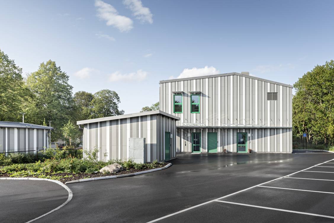 Cette école maternelle publique suédoise illustre à merveille la polyvalence des panneaux Swisspearl. L’élévation du bâtiment faisant face à l’entrée du public consiste en une ossature légère en acier revêtue de panneaux Swisspearl blancs perforés, assemblés verticalement avec de généreuses ouvertures depuis les balcons supérieurs qui donnent sur le jardin, tandis que le corps principal du bâtiment a été revêtu de bandes verticales originales de panneaux Swisspearl blancs, gris clair et gris foncé. Les châssis des fenêtres vert émeraude illuminent la palette de couleurs, apportant une touche de légèreté bienvenue pour une cole maternelle.