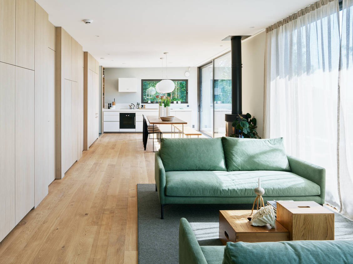 Les couleurs naturelles de l’environnement ont inspiré la palette de tonalités de cette maison. Les panneaux en fibres-ciment Swisspearl, les garde-corps des balcons et les parties visibles de la structure porteuse sont construits dans des tons gris vert discrets. Les panneaux de façade en bois Accoya apportent un ton chaud et naturel et les cadres en aluminium des portes et des fenêtres sont recouverts d’un revêtement en poudre noir. La combinaison de panneaux en fibres-ciment sur la paroi extérieure et de bardages en bois d’œuvre sur les surfaces intérieures de la façade a permis de créer un effet vivant sur les élévations. Les panneaux Swisspearl ont été choisis pour leur esthétique et leur durabilité face aux longs hivers humides. Les panneaux ont été découpés en longs formats verticaux cloués à un profilé en acier perforé de 25 × 120 cm.