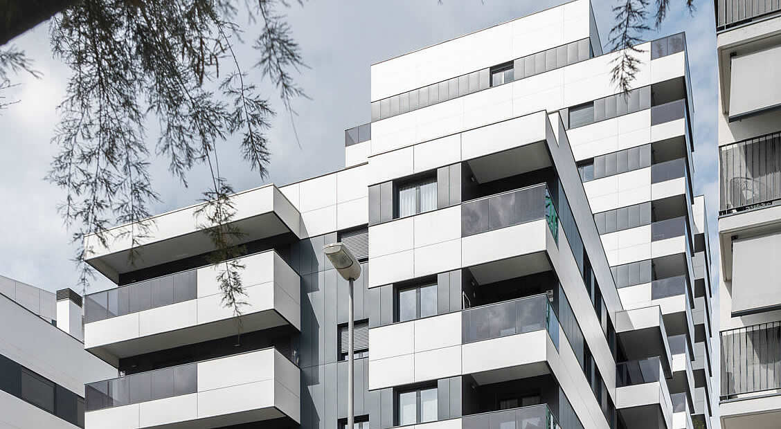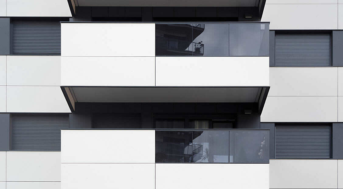 Torre Estronci 91 est situé dans un quartier aisé de Barcelone, l’Hospitalet de LLobregat. Les appartements offrent une combinaison idéale de modernité, de qualité, de confort et d’efficacité énergétique. Sur le plan esthétique, le bâtiment se caractérise par les rubans de panneaux horizontaux Copanel Swisspearl alternant le blanc et le noir : en encerclant la construction, ils créent une forte impression graphique. Les zones noires intègrent les fenêtres à cadre noir, tandis que les bandes blanches servent de parements aux balcons en saillie. Cette saillie et ce retrait des façades créent une impression de relief en hauteur et empêchent le bloc d’être perçu comme un voume monolithique.