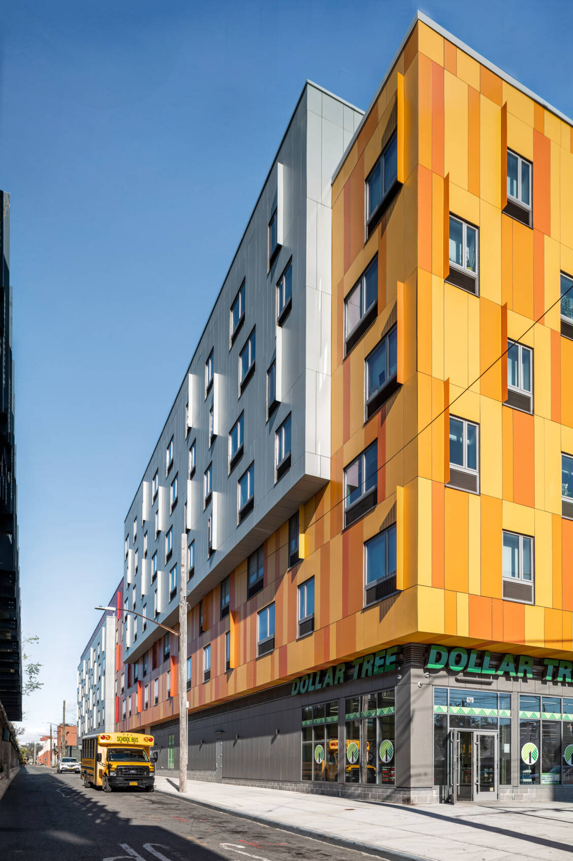 Van Sinderen Plaza longe la ligne ferroviaire aérienne en provenance de Manhattan. Le bâtiment arbore un dégradé de couleurs vives sur toute la longueur de la façade afin d’amplifier le mouvement linéaire des trains. Les deux extrémités commencent par un bordeaux foncé pour faire écho aux maisons résidentielles en briques du quartier, et passent progressivement du foncé au clair, du rouge au jaune, interrompant ainsi la linéarité du